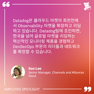 데이터독 한국 지사는 수도 서울의 중심부인 강남에 위치하고 있습니다. 한국 지사는 영업, 기술 지원 및 솔루션, 고객 성공, 마케팅 등 조직의 시장 진입 기능을 지원합니다. 전 세계 5,000명 이상의 직원들이 조직이 디지털 혁신을 실현하고 팀 전체의 협업을 촉진하도록 돕고 있습니다. 저희 제품은 엔지니어링 팀을 위한 투명성을 제공하며, 이러한 사고방식을 직장에서도 실현하기 위해 노력하고 있습니다.